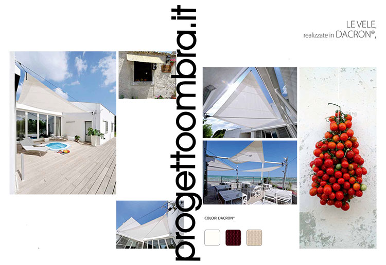 LE VELE, in Dacron ®, sono sostenuti da pali in acciaio inox o staffe a muro, e possono anche essere installati su elementi di ancoraggio già esistenti quali colonne o alberi.